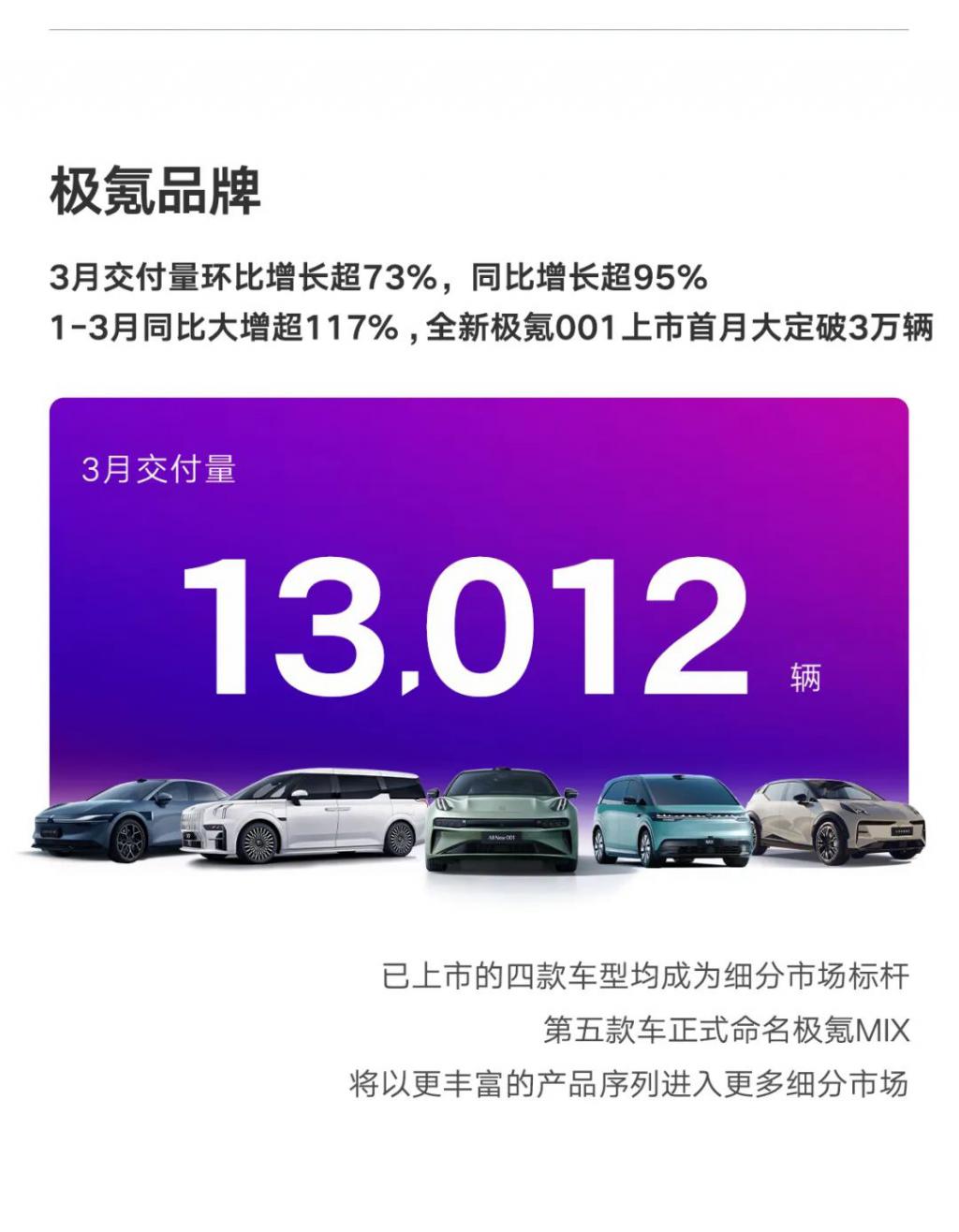 极氪品牌 3 月交付 13012 辆,环比增长超 73%,同比增长超 95%。1-3 月同比大增超 117%,全新极氪 001 上市首月大定破 3 万辆。