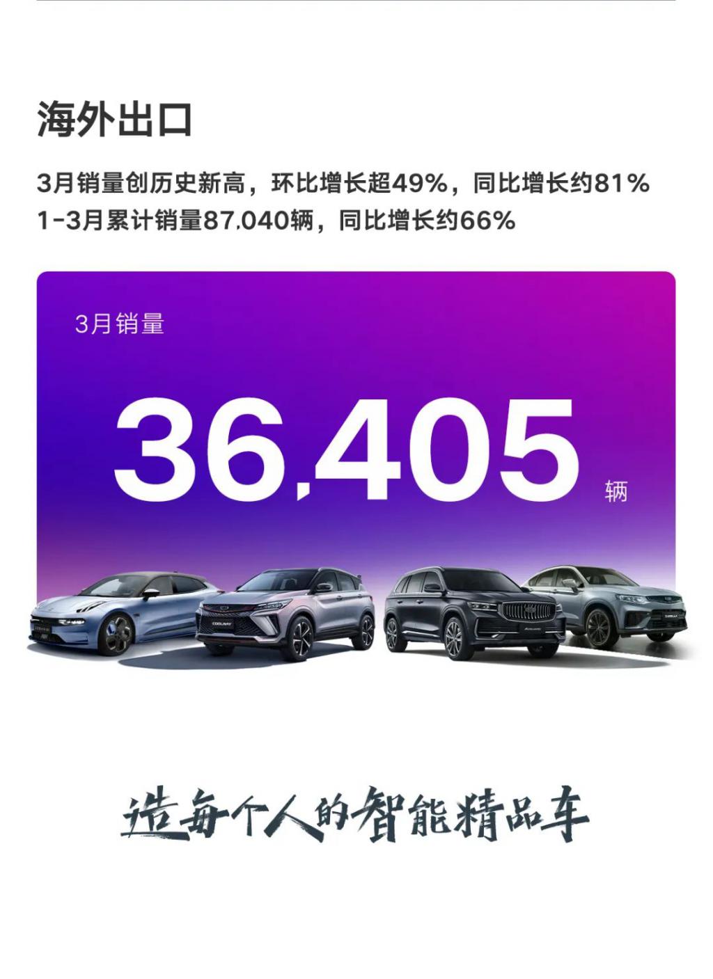 海外出口方面,3 月销量 36405 辆,环比增长超 49%,同比增长约 81%。1-3 月累计销量 87040 辆,同比增长约 66%。