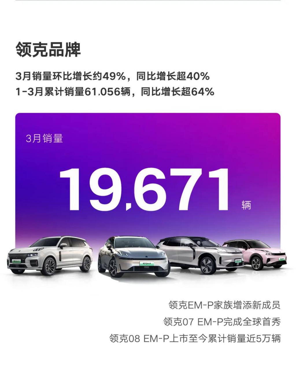 领克品牌,3 月销量 19671 辆,环比增长约 49%,同比增长超 40%。1-3 月累计销量 61056 辆,同比增长超 64%。此外,领克 08 EM-P 上市至今累计销量近 5 万辆。