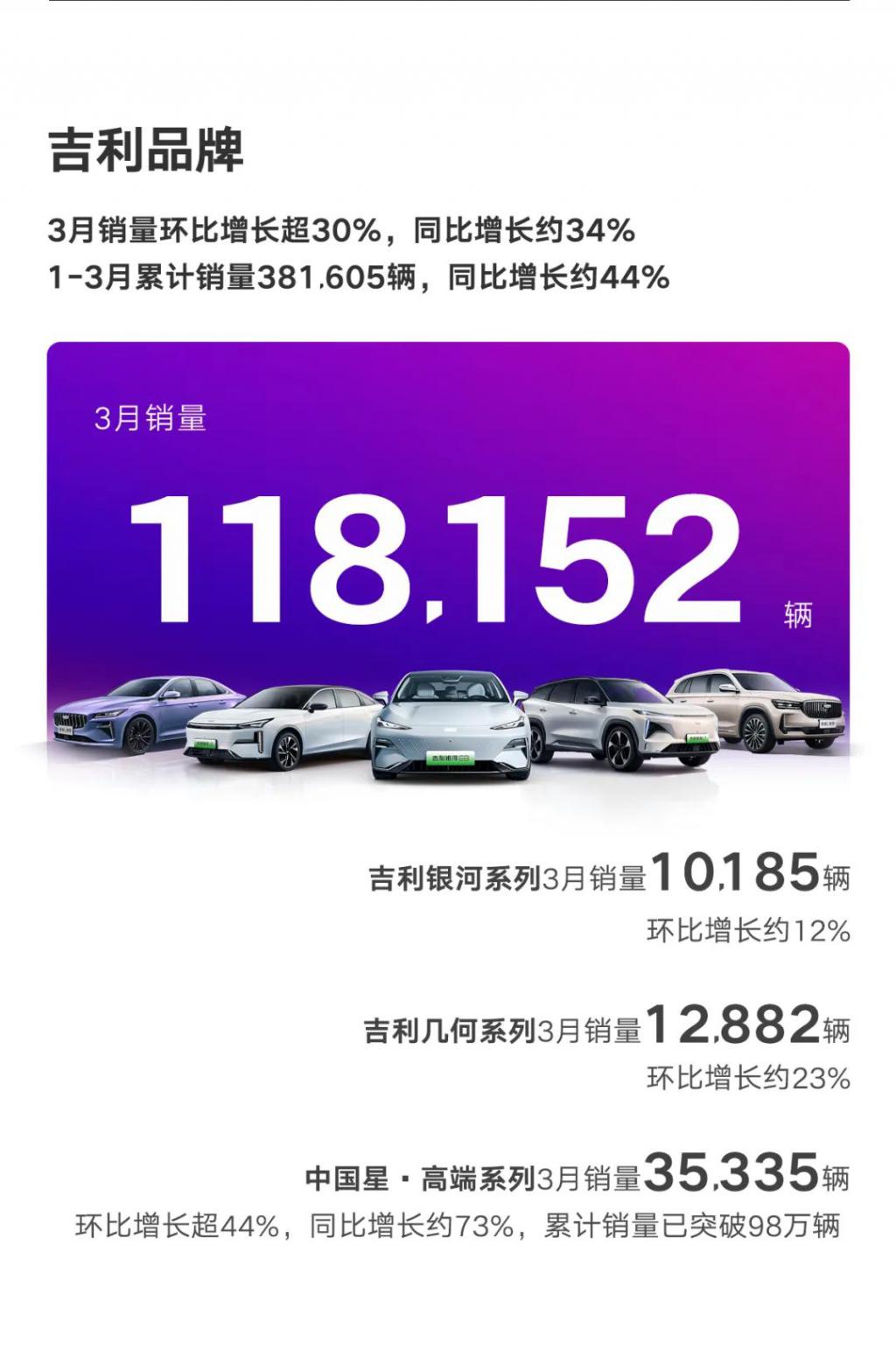 具体来看,吉利品牌 3 月销量 118152 辆,环比增长超 30%,同比增长约 34%。1-3 月累计销量 381605 辆,同比增长约 44%。其中吉利银河系列 3 月销量 10185 辆,环比增长约 12%。吉利几何系列 3 月销量 12882 辆,环比增长约 23%。中国星 · 高端系列 3 月销量 35335 辆,环比增长超 44%,同比增长约 73%,累计销量已突破 98 万辆。