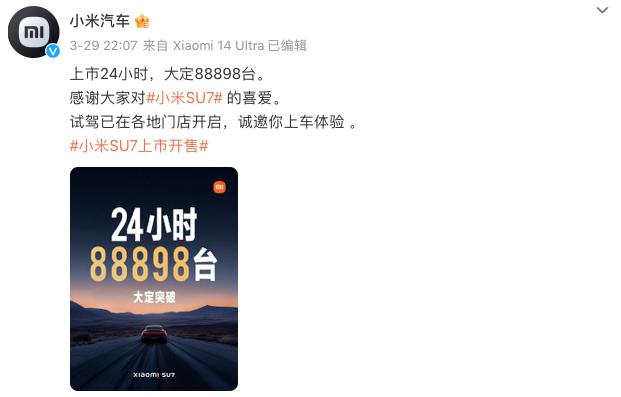 该车一上市直接火爆市场,官方数据显示:上市发布会后小米 SU7 开启预定,4 分钟时间新车大定就破万,7 分钟大定破 2 万,27 分钟大定破 5 万,首日大定数为 88898 台。截止昨日,小米创始人雷军透露,小米 SU7 开售至今,大定数量已超 10 万。