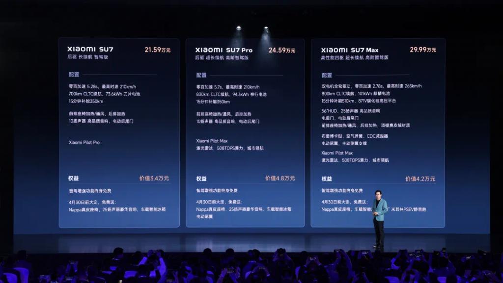 据了解,小米 SU7 在 3 月 28 日上市,新车定位中大型纯电轿车 , 共推出 3 款车型。其中,标准版售价 21.59 万元,搭载单电机、5.28s 零百加速、CLTC 续航 700 公里。小米 SU7 Pro 版售价 24.59 万元,Pro 版与标准版的区别在于增加了 20.7kWh 电池、激光雷达、小米智驾 Max 城市 NOA。小米 SU7 Max 版售价 29.99 万元,其性能及操控方面比起前两个版本更强,拥有 2.78s 零百加速、265km/h 最高时速、续航达 800km CLTC 。