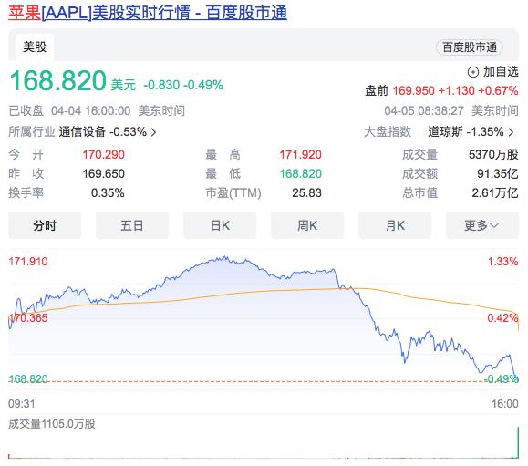 截至 4 月 4 日美东时间收盘,苹果公司报收 168.82 美元,下跌 0.49%,总市值为 2.61 万亿美元。