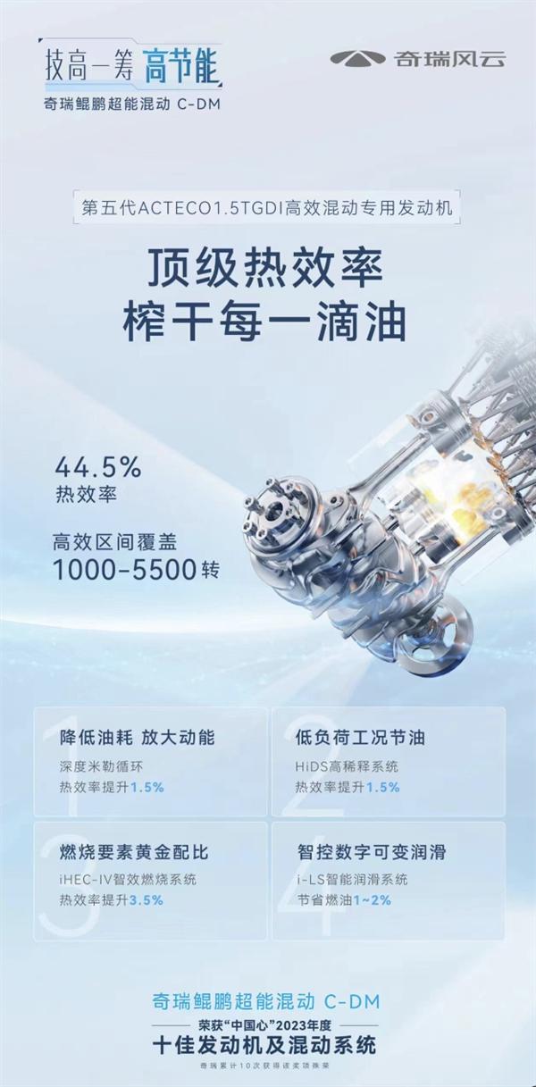 这款中型 SUV 配备了奇瑞鲲鹏超能 CDM 混动系统,综合续航超过 1400km,纯电续航达到 165km。