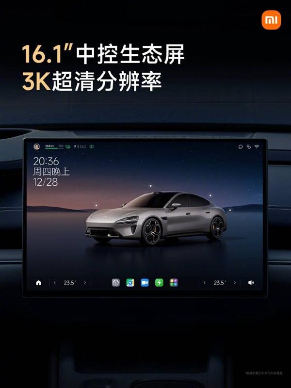 据了解,小米 SU7 搭载了小米自研的智能座舱系统,配备了一块 16.1 英寸的生态中控屏幕。