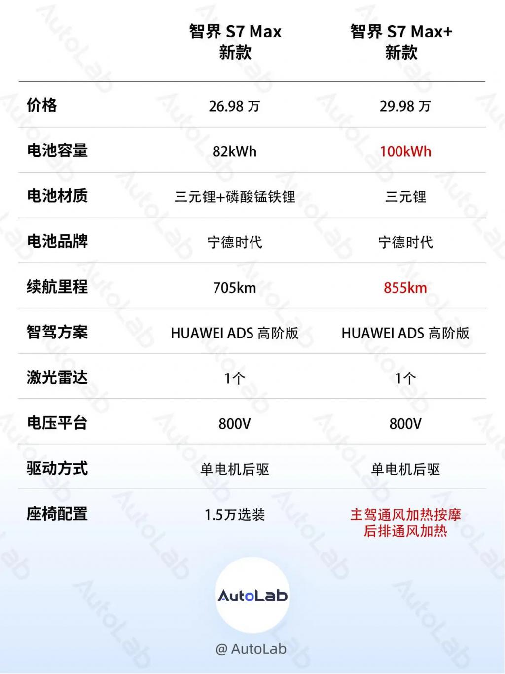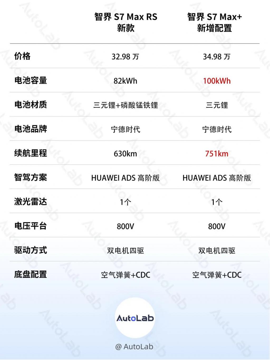 乍一看,配置的确增加了不少,但相比于 S7 Max+,电池容量却从 100 度减少到了 82 度,续航里程缩短至 630km。