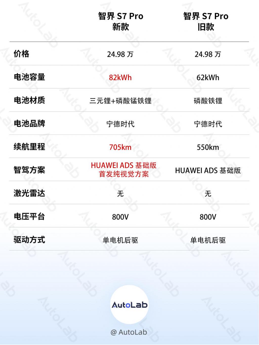 在价格不变的情况下,新款智界 S7 Pro 的续航里程从 550km 提升到了 705 km,达到了同级别主流水平。