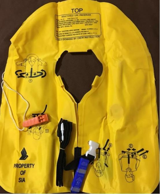 飞机上的救生衣是黄色和红色的。这两种警告颜色使救援人员很容易在海洋中找到和辨别,红色供船员使用,黄色供乘客使用。救生衣由尼龙材料制成,上下各有两个安全气囊,起到双重保险的作用。