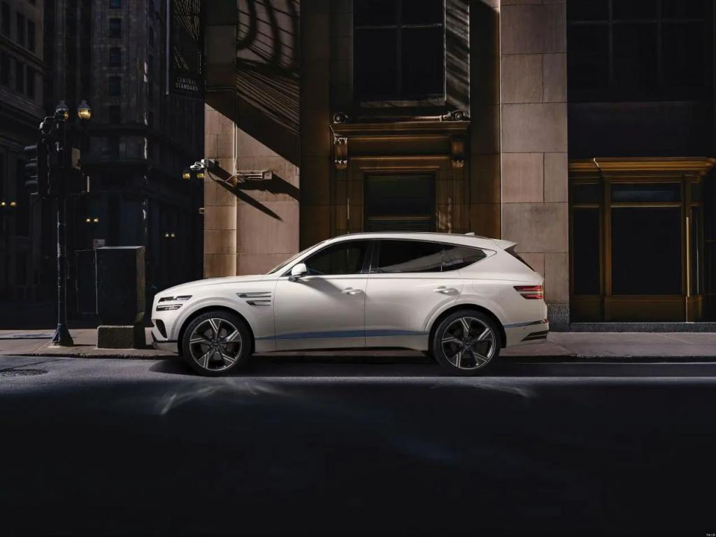 侧面造型,GV80 的车顶略带一点弧度,配备有鲨鱼鳍以及行李架,有着比较强的力量感。新车提供 19 英寸、20 英寸双色轮毂和 22 英寸五辐曜黑轮辋可选,前轮还标配了四活塞卡钳。