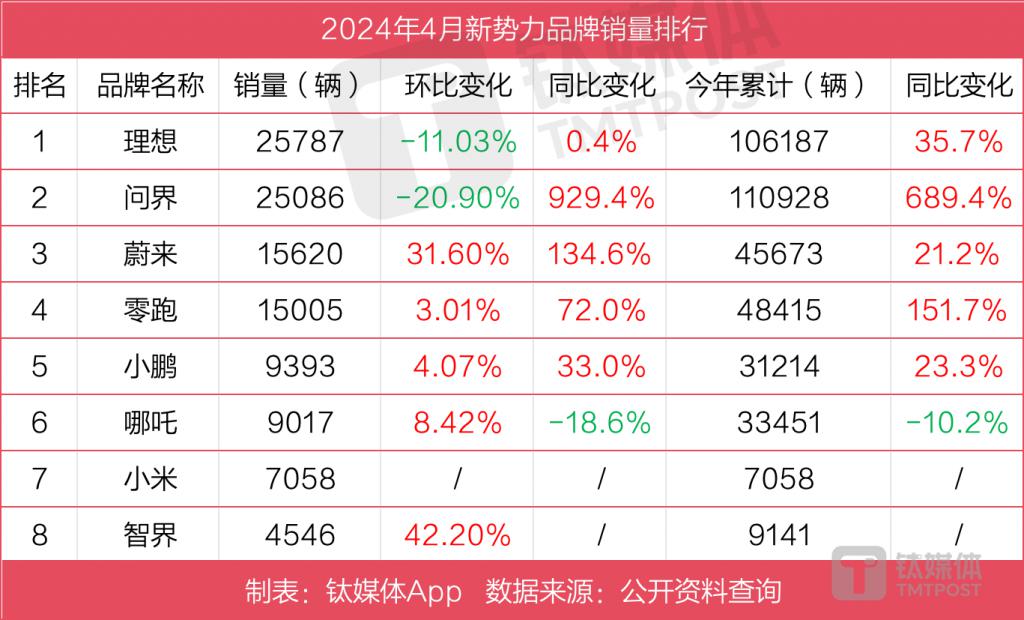 和理想一样,问界目前的焦虑也是此前 " 爆卖 " 的 M7,现在开始显现出增长疲软的迹象。问界 4 月交付 2.5 万辆,同比大增 929%,但环比下滑了 20.9%。造成环比下滑的主因是问界 M7 的增长放缓,其 4 月交付回落到 1.1 万辆,与年初的最高 3 万辆月销水平相比,有着不小的差距。
