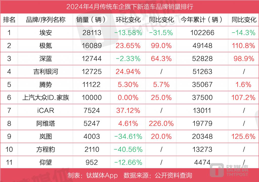 不过,即便如此,埃安仍是最能卖的传统新势力,其前 4 月累计销量已超过 10 万辆,是唯一做到这点的传统新势力。而且,埃安对高端市场的探索已初具成果,旗下高端品牌昊铂已开始展现出增长势头。