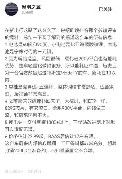 据悉,乐道新车提供了 60 度和 90 度两种容量的电池选择,小电池采用比亚迪磷酸铁锂电池,大电池则来自宁德时代三元锂电池,确保了车辆的强劲动力和持久续航。值得一提的是,乐道凭借其轿跑造型和碳化硅 900V 平台,实现了超低风阻和出色的能耗表现。据官方数据,乐道的能耗在 13 以内,成为历史上第一台官方数据超过特斯拉 Model Y 的车型。
