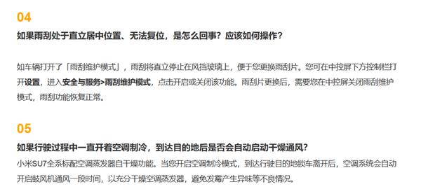 小米汽车还介绍,如果雨刮处于直立居中位置、无法复位,是因为车辆打开了 " 雨刮维护模式 ",此时,雨刮将直立停止在风挡玻璃上,方便更换雨刮片。
