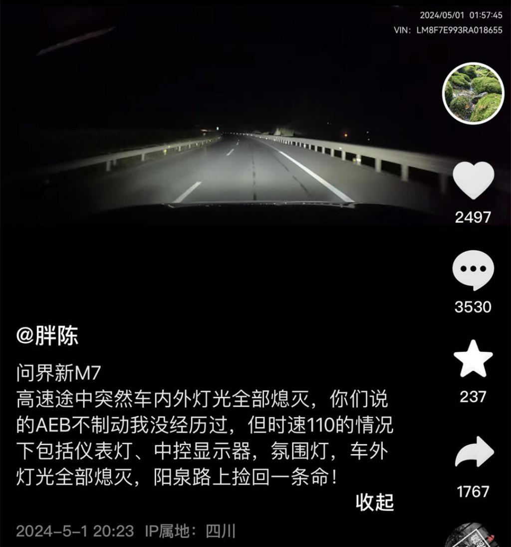 问界回应新 M7 夜间行车大灯突然熄灭:车主操作失误,问题已解决