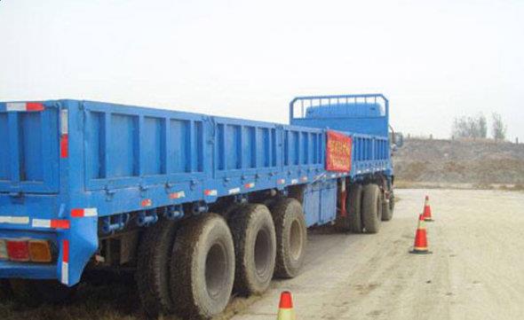 半挂车与邻车并排确认与邻车相距约1米,确认后面安全后直线倒车,当车辆后保险杠并排时停车。右转方向盘,倒车至目标位。车停时,将方向盘向右打到底。稍微放松制动踏板,利用半挂车蠕动功能进行倒车。车身左侧面到达某点延伸直线上时停车。左转方向盘,使轮胎回正之后倒车。在车停时,回转方向盘使轮胎回正;缓慢地直线倒车,左后轮达到停车位外侧白线时,停止倒车。将车向右边靠近,将半挂车方向盘向左打到底,缓慢退行;在车辆与路肩平行之前,回转方向使车辆回正,将车辆停在与路肩平行的位置即可。