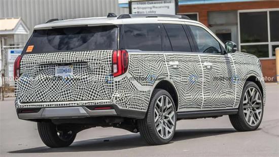 车身侧面,新车采用隐藏式的 B、C、D 柱设计,营造出悬浮式车顶的感觉。虽然伪装较多,但不难看出新车在车侧会采用内凹式设计,平行式的腰线也可给车侧带来更多层次感。24 英寸的轮圈,还可进一步凸显美式全尺寸 SUV 的属性。