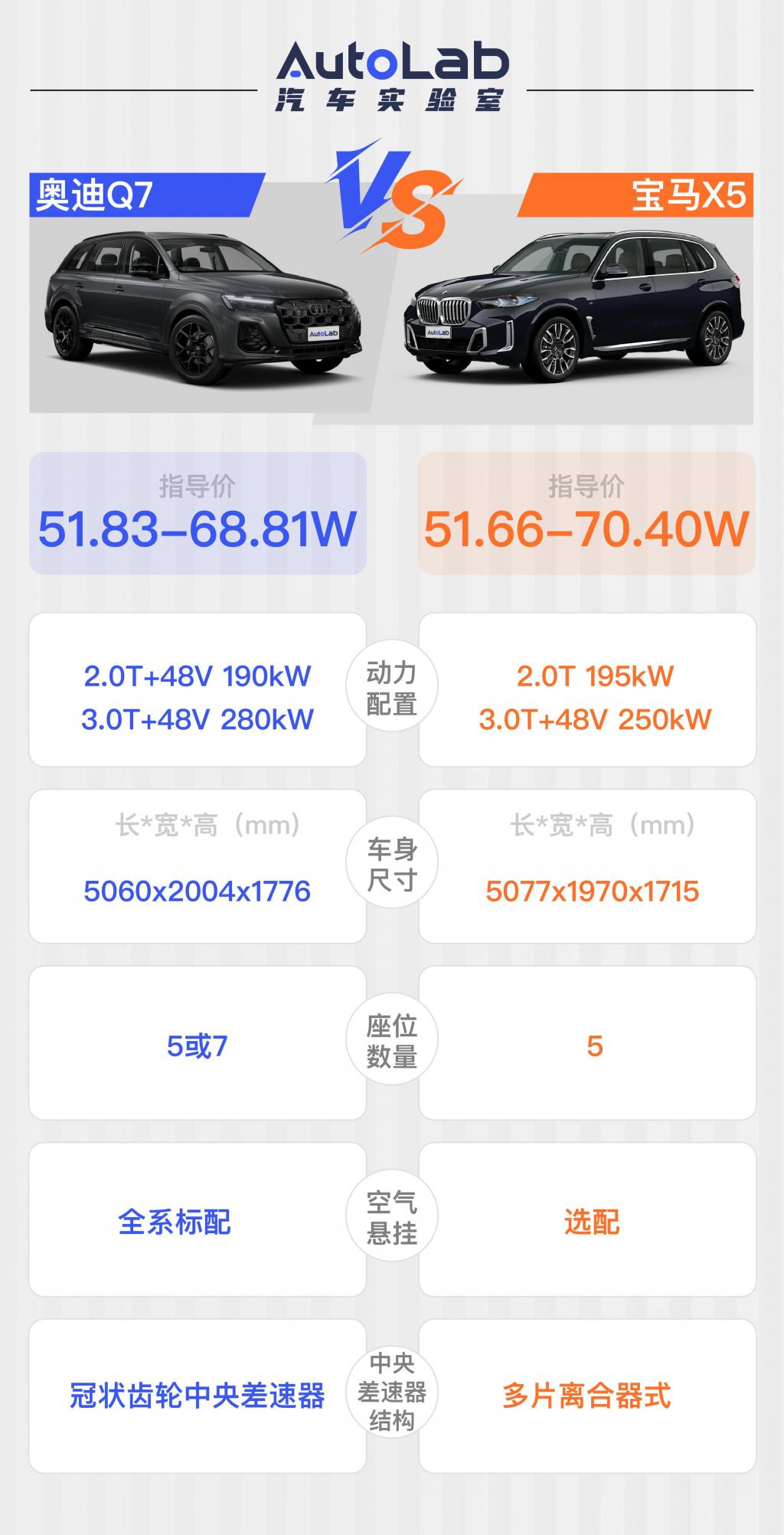 那么,现在的奥迪 Q7 产品力究竟如何?难道奥迪 Q7 输了 " 面子 ",作为 " 里子 " 的机械素质也不如别人吗?我们做了个简单的对比。