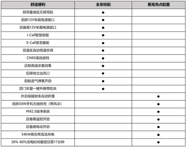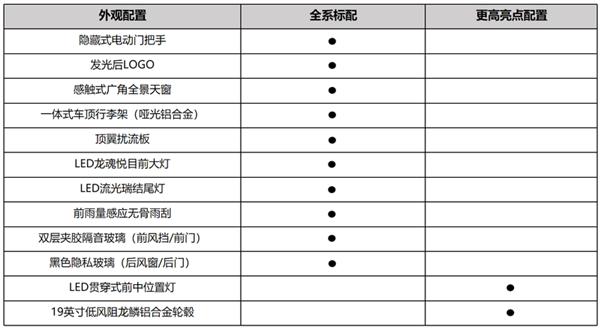 新车标配隐藏式门把手、发光尾部后 LOGO、哑光铝合金的一体式车顶行李架、感触式广角全景天窗及电动遮阳帘、隐藏式天线等配置,全同时还配有双层夹胶隔音玻璃、隔热玻璃、黑色隐私玻璃,高配版拥有 LED 贯穿式前中位置灯、19 英寸低风阻龙鳞铝合金轮毂等。