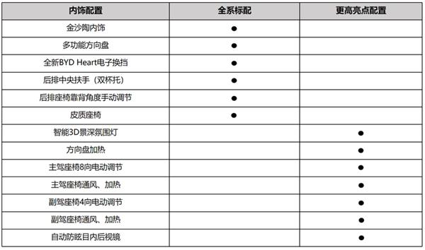 全系标配专属 " 金沙陶 " 内饰、多功能方向盘、全新 BYD Heart 电子挡杆、双杯托后排中央扶手、后排座椅靠背支持手动调节。