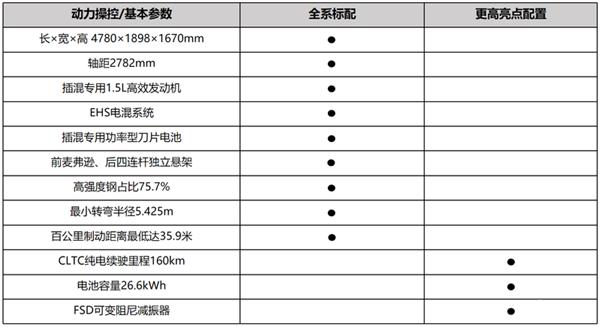 载比亚迪第五代 DM 技术,以骁云 - 插混专用 1.5L 高效发动机、EHS 电混系统和插混专用功率型刀片电池为核心,全新中型插混专用高性能底盘架构、前麦弗逊 + 后四连杆独立悬架、FSD 频率可变阻尼减振器,5.42 米的转弯半径和最低 35.9 米的百公里制动距离同级领先。