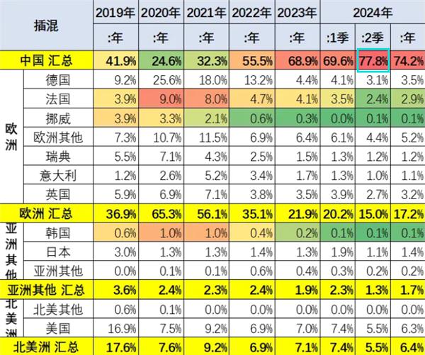 2021 年达到 32%,2022 年进一步上升至 56%,2023 年更是攀升至 69%。到了 2024 年上半年,这一比例达到了惊人的 74%,其中第二季度更是高达 78%。这一系列数据清晰地标志着中国在插电式混合动力车领域的领先地位日益巩固。