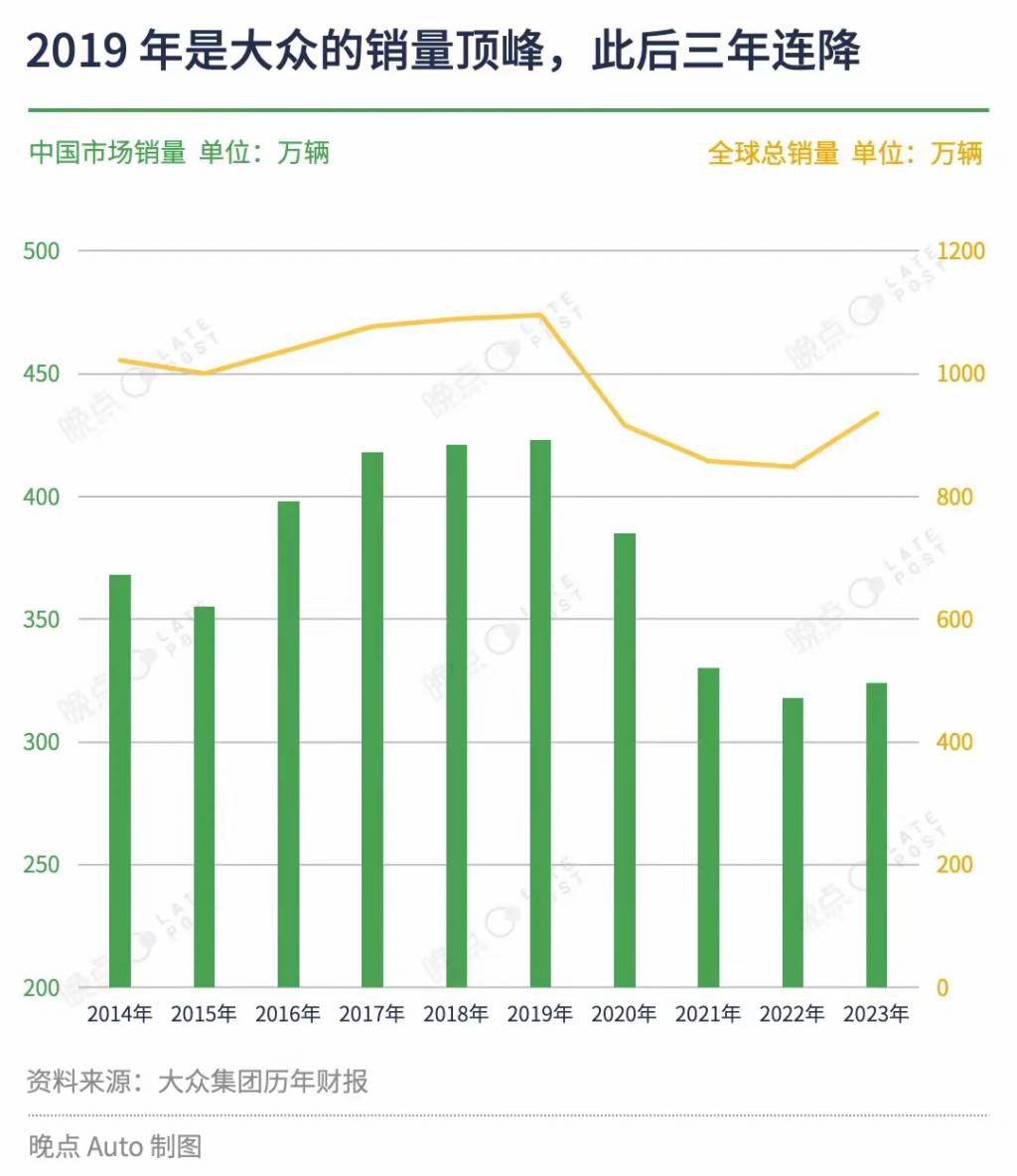 从 1990 年到 2019 年,大众汽车年销量从 300 万辆增长到 1097 万辆,中国市场贡献了销量的 423 万辆,占全球总销量约 40%,连续多年蝉联全球最大单一市场。从 1985 年到 2023 年,大众汽车始终占据中国汽车市场份额第一,直到新能源车(包括插混)对纯燃油车的加速替代。自新冠疫情爆发后,大众汽车在中国市场销量开始出现下滑,从 2019 年的 423 辆到 2020 年的 385 辆,再到 2023 年的 323 辆,四年时间减少约百万辆。进入 2024 年后,随着自主品牌加速蚕食合资品牌市场,尽管大众积极加入与中国车企的 " 价格战 ",但销量还是出现下滑,仅 135 万辆。