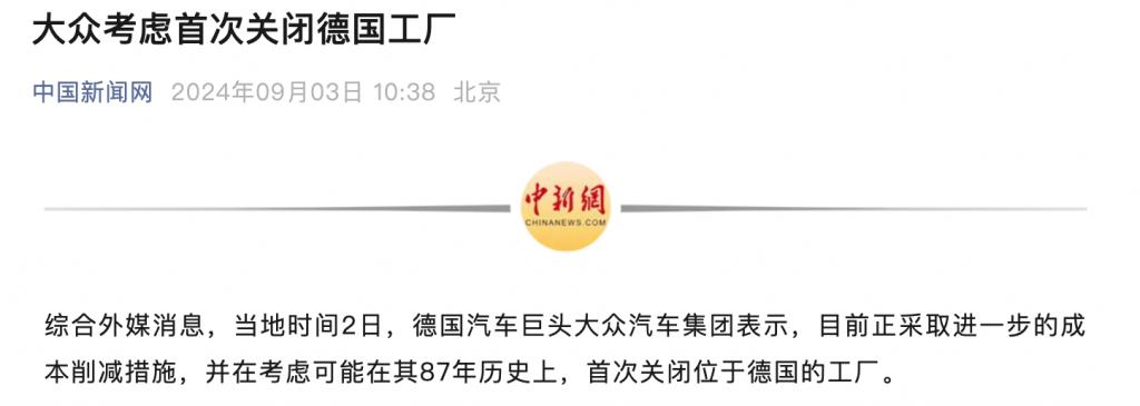 9 月 2 日,德国大众汽车发布声明称,为了解决产能过剩和竞争力下降的问题,并进一步削减成本,将考虑关闭德国工厂,包括一家较大的汽车制造厂和一家零部件工厂,涉及大众集团主要乘用车品牌。据了解,这将是大众汽车自 1926 年成立以来首次关闭德国境内的工厂,德国本土工厂的关闭和强制裁员计划将于 2026 年前完成。