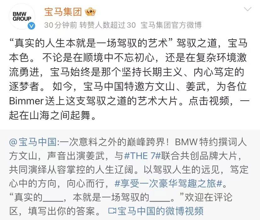 汽车行业的 " 卷 ",近几年变成了常态。在行业内卷的新常态下,各大车企都在争相竞逐,营销加码。比如宝马又整活了,找来了方文山写文案、姜武配音,为各位 Bimmer 送上一条驾驶之道的艺术大片。