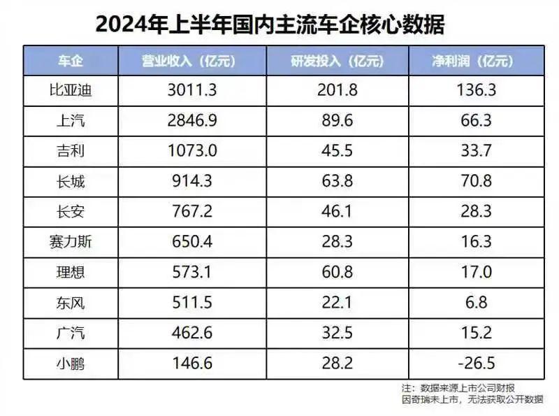 不夸张的说,就以⽐亚迪上半年研发投⼊来算,它的投入甚至是⻓城的三倍以上,是吉利的四倍以上。