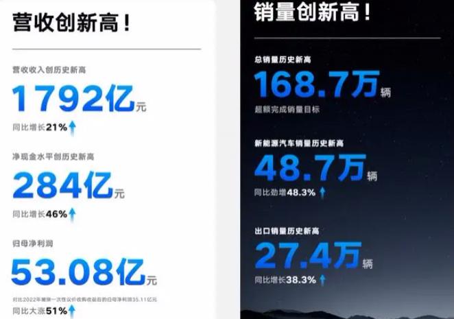 营收、利润 " 双增长 " 的,还有吉利汽车。2025 年,吉利汽车实现营收 1792 亿元,同比增长 21%;归母净利润 53.08 亿元,同比大涨 51%。这一年,吉利的新能源销量为 48.7 万辆,同比增长超过 48.3%。2024 年,吉利在新能源上的愿景是销量增加 66% 以上,超过 73 万辆。
