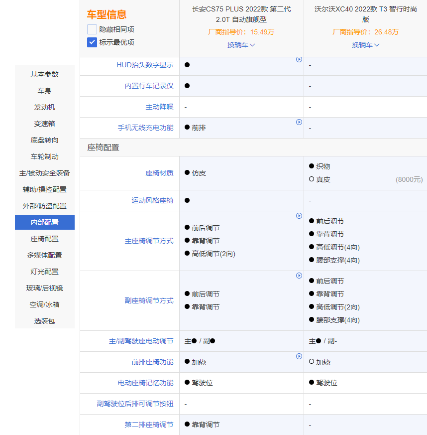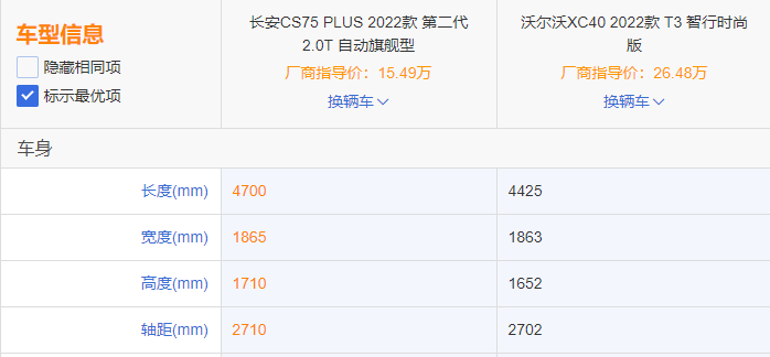在配置方面,我们选取了两车价格相比较最接近的长安CS75 PLUS 2022款 第二代 2.0T 自动旗舰型(经销商报价:15.49万)和沃尔沃XC40 2022款 T3 智行时尚版(经销商报价:21.28万)进行对比,看看谁更具诚意。