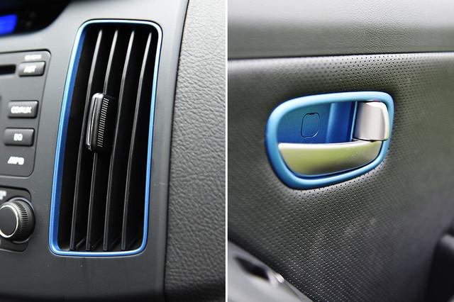内饰方面,伊兰特EV同样沿用了老款悦动的整体造型,只是在部分细节上进行了调整,新车在空调出风口、挡把周围、门把手等多处细节上采用了蓝色装饰,同时搭载了液晶仪表盘,更加富有现代感。配置方面,新车搭载电动天窗、收音机、CD、自动空调、多功能方向盘、AUX/USB接口,倒车雷达等。
