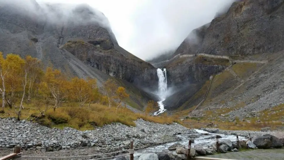 更有趣的是在观日峰和天豁峰之间飞流而出一道池水,形成了长白瀑布,形成一景。