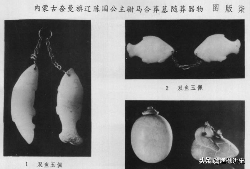 所谓双鱼玉佩是1986年出土于内蒙古自治区哲里木盟(今内蒙古通辽市)奈曼旗辽陈国公主及驸马合葬墓出土的玉佩,为白玉圆雕,用阴线刻出眼、腮、腹鳍、尾等细部,双鱼嘴部穿孔用金链系佩。
