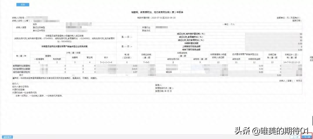 3.填写增值税(附列资料,增值税减免税申报明细表,小规模纳税人主表)点击“下一步”,需要点击三次~