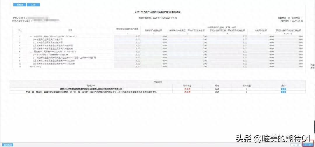 1.页面的圈1至圈7有4种颜色,灰色圈表示未填写,黄色圈表示已填写,绿色圈表示已提交;该页面底下六项显示的强制检测和非强制检测点,检测结果全部通过的情况下,操作结果后面会显示绿色“√”(强制检测显示不通过则要核查其原因,非强制检测点纳税人根据自身情况完成相对应的操作),击“下一步”;