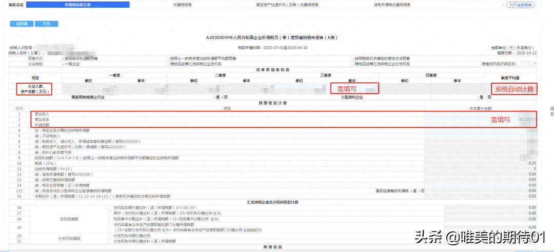 注意:所得税申报主表里面需要填写“从业人数”“资产总额”该处不可以填写0哦,附报信息里 “高新技术企业”“科技型中小型企业”“技术入股递延纳税事项”根据纳税人自身情况进行选择“是”或“否”;