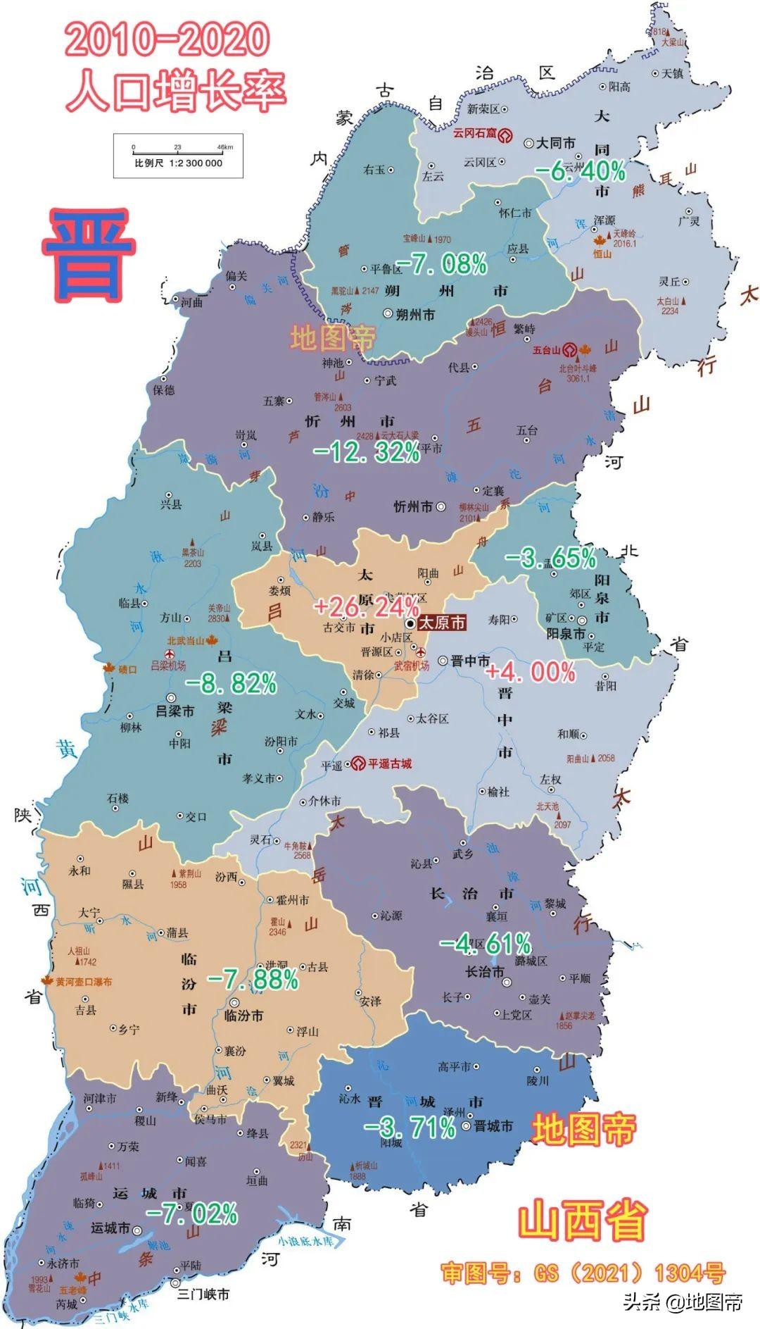 山西省共有十一个地级市,除了太原和晋中,其他城市的人口增长率全是负数。古都之一的煤城大同,面积1.41万平方公里,人口只有约310万,人口增长率-6.4%。