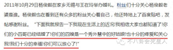 杨俊毅还为此专门上百度贴吧回帖感谢粉丝关系,并说自己跟四嫂过得十分幸福