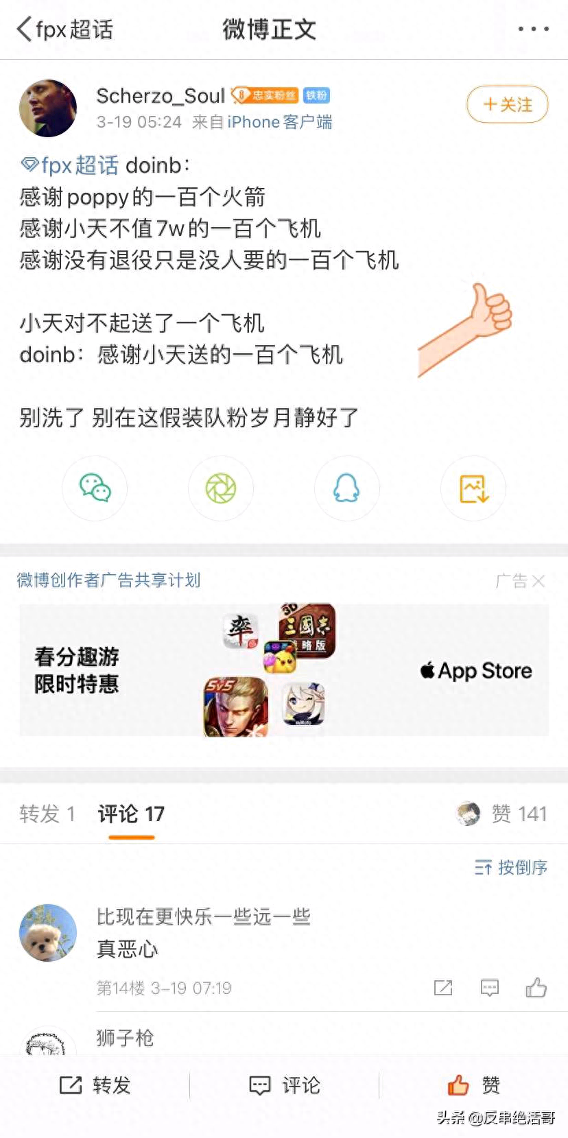 关于唐小幽卖减肥茶收割粉丝和她以前DNF的事就不再叙说。世间再无金咕咕,只剩金拉夫。最大的粉已经取关,一夜之间掉了好几万的粉,要知道总粉有不少是僵尸粉,掉的可就真是活粉了。以后高二叔打野建议用奥拉夫铁哥们皮肤,不为什么就因为有头盔,不会真有人打职业不戴头盔吧?可怜的V5不知道他们将要面对怎样的局面,所有愤怒都将发泄在他们身上,盲猜如果不被办的话会选克烈和卡萨丁。我话说完了谁赞成,谁反对。