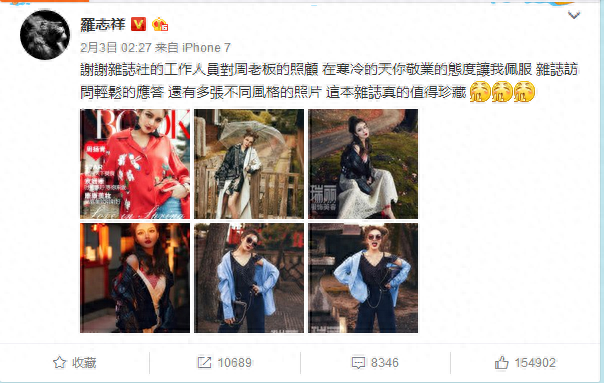 昨日罗志祥在微博晒出一组女友周扬青拍摄的写真,并且毫不吝啬的表达爱意:“谢谢杂志社的工作人员对周老板的照顾,在寒冷的天你敬业的态度让我佩服,杂志访问轻松的应答,还有多张不同风格的照片,这本杂志真的值得珍藏。” 真是越爱越高调的节奏啊~~