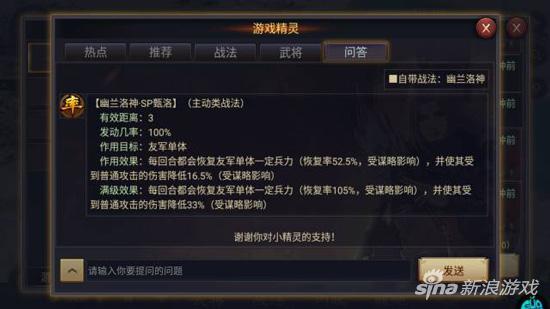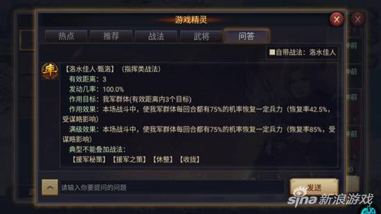 在本场战斗中,使我军群体每回合都有75%的几率恢复一定兵力(恢复率85%,受谋略属性影响)这里甄洛这个战法是属于指挥战法的,每回合只要脸不黑就会每回合都会奶(如果脸黑出现甄洛不奶的时候,我怀疑你抽到了一个假甄洛,或者是你的甄洛有一个假技能~)。并且是群体奶。当然这个技能唯一介绍就是奶了。这里注意这是一个指挥战法并且可以奶三个人,当然有一定的几率奶不到。