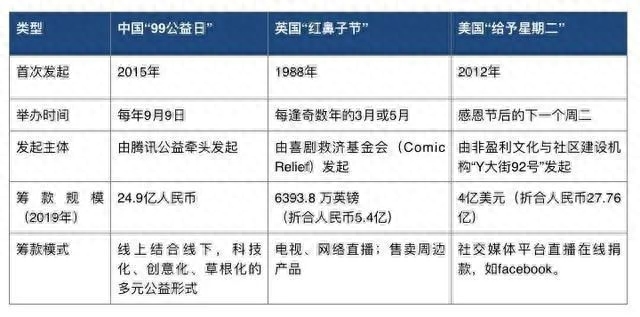 ▲ 99公益日与世界两大公益节“红鼻子节”与“给予星期二”的比较 (图源:南都周刊)