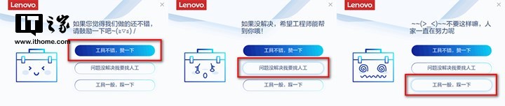 值得一提的是,软件使用完关闭后,会有一个卖萌的小界面,赞一下和踩一下点完之后直接就关闭了,点击“问题没解决我要找人工”,就会关闭软件跳转到联想人工客服界面,刚开始是机器人,可手动转人工客服,这个细节还是很好的,提出表扬,联想不管再怎么容易招黑,售后质量还是妥妥的第一梯队。