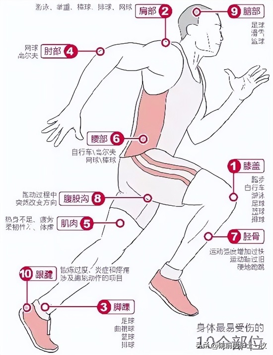 大腿后侧腘绳肌、大腿前侧股四头肌、小腿后侧三头肌、小腿侧前方腓骨长短肌、胸大肌、髂腰肌,其中腘绳肌拉伤最为常见。