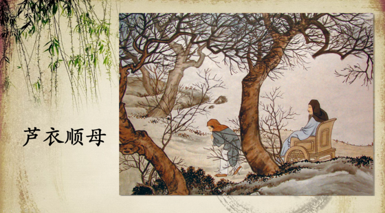 故事:他的生母去世的早,后来父亲又娶了一个妻子,生有两子。后母对闵损十分苛刻,经常虐待他,寒冬时节,她给自己的两个亲生儿子用棉花做冬衣,却用芦花给闵损做冬衣。一次闵损和父亲一起出门,实在是受不住寒冷,在牵着马车时不小心将绳子掉在地上,父亲十分生气,对着他责怪抽打,却发现了他衣服里的芦花,这才知道自己的儿子经常受到虐待。于是一气之下想要休掉妻子,但闵损跪着求父亲,跟父亲说现在只是自己一个人受冻,母亲走了,几个孩子就都得受冻了。父亲很是感动,便就此作罢,闵损的后母也认识到了自己的错误,很是后悔,从此以后将他像亲生儿子一样对待。