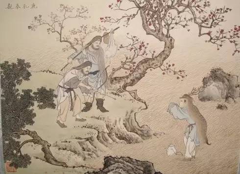 故事:郯子天性孝顺,他的父母有眼疾,知道鹿乳有治疗的功效,但一时又想不到什么办法。于是郯子便自己披上鹿皮,找到机会混到鹿群里面,想着挤些鹿乳回去给父母喝。不料有猎人前来打猎,竟真以为郯子是鹿,一心想着射猎他,郯子急忙起身,解释缘由,猎人听闻,被他的孝行感动,不但给了他些鹿乳,还保护他出了深山。