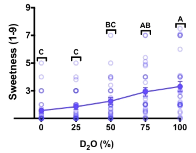 在另一项由娜塔莉·本·阿布主导的实验中,28名参与者在开鼻式味觉测试中有22名准确区分出了重水,根据他们的主观反馈,纯重水的甜味显著,但比较轻微,平均甜度为3.3±0.4(1无感,3轻微,5中等,7非常,9齁甜)。