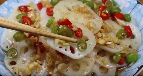 5:锅中加入适量清水,加盖大火烧开,水开后再加入适量的白醋,加入白醋可以防止莲藕氧化变黑。然后将莲藕放入锅中焯水,时间不要太长,大概焯水30秒钟左右就可以了。否则时间太长的话,莲藕口感就会不清脆。时间到了将莲藕控水捞出,接下来放入凉开水中过一遍凉水。这样过凉后做出来的莲藕更加清脆好吃。拨凉后控水捞出,将莲藕片装入盘中,最后再将料汁浇在藕片上。