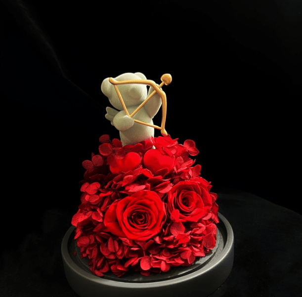 SEEROSE 甄选厄瓜多尔鲜玫瑰,利用特殊工艺将花朵最新鲜艳丽的一刻定格下来。玩偶用的是丘比特之箭的造型,站立在绚烂嫣红的玫瑰花上,将爱神丘比特幻化为可爱小熊与永生玫瑰浪漫融合,旨在希望爱情“不仅仅是一见钟情,还可以一往情深”!
